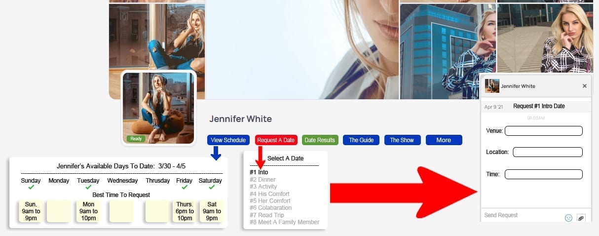 Click on a profile... like who you see? Request a date! Profiles contain a scheduler that shows the best days & times available for coordinating dates along with setting up the venue, location, and other date details.